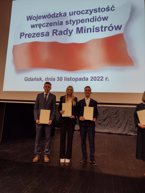 30 listopada 2022 r. w sali teatralnej Uniwersytetu Gdańskiego zostały wręczone dyplomy Stypendium Prezesa Rady Ministrów na rok szkolny 2022/2023. Stypendium przyznaje się uczniowi, który otrzymał promocję z wyróżnieniem, uzyskując przy tym najwyższą w danej szkole średnią ocen lub wykazuje szczególne uzdolnienia w co najmniej jednej dziedzinie wiedzy, uzyskując w niej najwyższe wyniki, a w pozostałych dziedzinach wiedzy wyniki co najmniej dobre. Stypendium przyznaje się jednemu uczniowi danej szkoły na okres od września do czerwca w danym roku szkolnym.