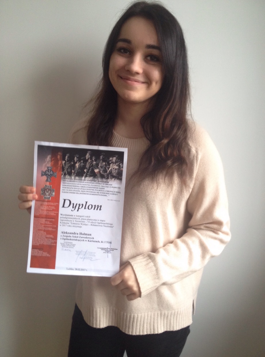 Aleksandra Halman, uczennica klasy I TOR zdobyła wyróżnienie w Ogólnopolskim Konkursie „Żołnierze Wyklęci – Bohaterowie Niezłomni” w kategorii plastycznej – Gratulujemy i życzymy dalszych sukcesów! |