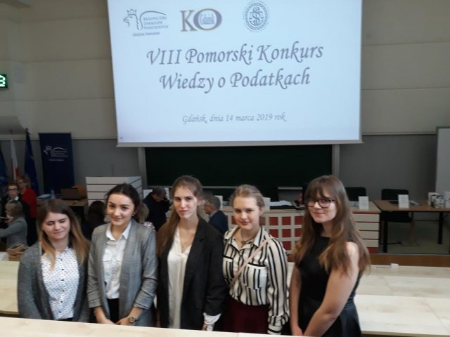 Na Wydziale Prawa i Administracji Uniwersytetu Gdańskiego w dniu 14 marca 2019 r odbył się etap wojewódzki Ogólnopolskiego Konkursu Wiedzy o Podatkach, Martyna Tusk z klasy III TE zajęła I miejsce, Joanna Łaszewska z klasy III TE zajęła II miejsce i Anita Krefta z klasy II TE zajęła III miejsce i w ten sposób zakwalifikowały się do finału, który odbędzie się na Uniwersytecie Śląskim w Katowicach.