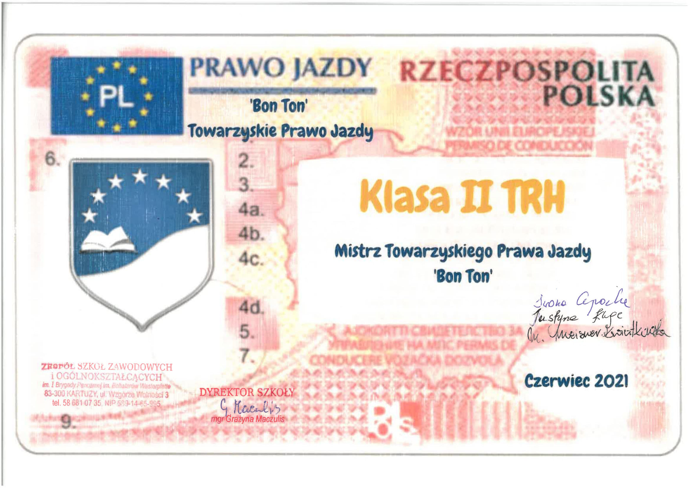 - I miejsce i Tytuł „Mistrza Towarzyskiego Prawa Jazdy” otrzymuje klasa II TRH – 105 pkt