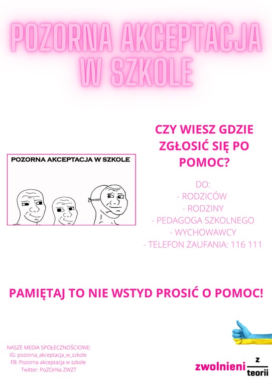 Dnia 25.03.2022r. uczennice z III Liceum Ogólnokształcącego w Kartuzach przeprowadziły warsztaty w SP w Kożyczkowie . Warsztaty odbyły się w ramach Ogólnopolskiej Olimpiady „ Zwolnieni z Teorii” . Projekt dotyczył „ Pozornej akceptacji w szkole” i skierowany był głównie do uczniów klas 5 i 6 szkół podstawowych . Dziewczyny ze Wzgórza odwiedziły Szkołę Podstawową w Kożyczkowie aby porozmawiać z dziećmi o akceptacji . Warsztaty opierały się głównie na prezentacji opowiadającej o samoocenie oraz na prezentacji krótkich filmików związanych z tematem. Projekt ma na celu przedstawienie problemu oraz zmobilizowanie dzieci do sięgania po pomoc w przypadku braku akceptacji.