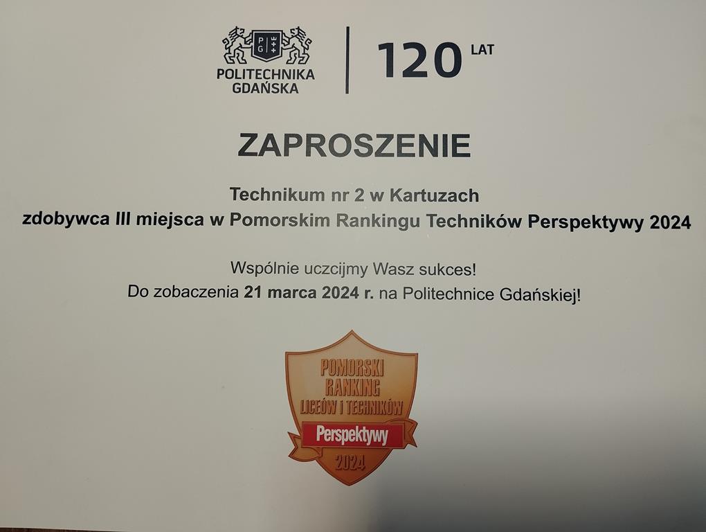 Z ogromną przyjemnością informujemy, że nasza szkoła zajęła 3 miejsce w województwie pomorskim w Ogólnopolskim Rankingu Techników przygotowanym przez „Perspektywy”. W skali kraju zajęliśmy 51 miejsce i tym samym uzyskaliśmy Złotą Tarczę. Podczas konferencji na temat planowanych obchodów 120-lecia uczelni technicznej na Politechnice Gdańskiej 10 stycznia 2024 r. w imieniu szkoły pan Mirosław Szutenberg – kierownik szkolenia praktycznego odebrał gratulacje i zaproszenie na uroczystą galę Pomorskiego Rankingu Liceów i Techników Perspektywy 2024, które odbędzie się 21.03.2024 z udziałem dyrektora pani Joanny Stencel. Ten wynik jest odzwierciedleniem ogromu wysiłku i pracy włożonej przez uczniów naszej szkoły. To ich zaangażowanie w rzetelne podejście do obowiązków szkolnych dało przełożenie na sukces w rankingu Perspektywy 2024 i sięgnięcie przez naszą szkołę po „Złotą Tarczę” – Najlepsze Technika w Polsce Perspektywy 2024”. Pragniemy również zaznaczyć, że osiągnięcie tego wysokiego wyniku i zajęcie 3 miejsca w województwie było możliwe również dzięki zaangażowaniu i wysiłkowi włożonemu przez nauczycieli naszej szkoły w przygotowanie uczniów do egzaminów zawodowych, maturalnych i olimpiad oraz zdobywanie przez nich kompetencji potrzebnych w świecie, do którego zmierzają. Tegoroczny sukces jest dla nas potwierdzeniem, że praca przyniosła wymierne efekty, zarówno dla uczniów, nauczycieli jak i pracowników szkoły.