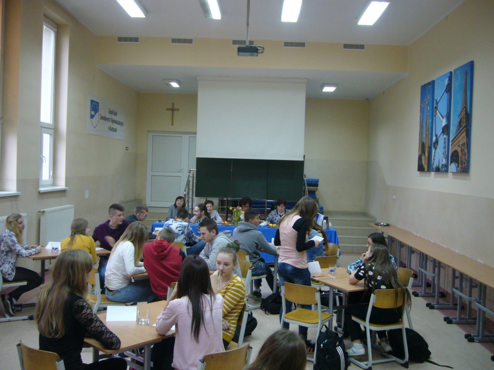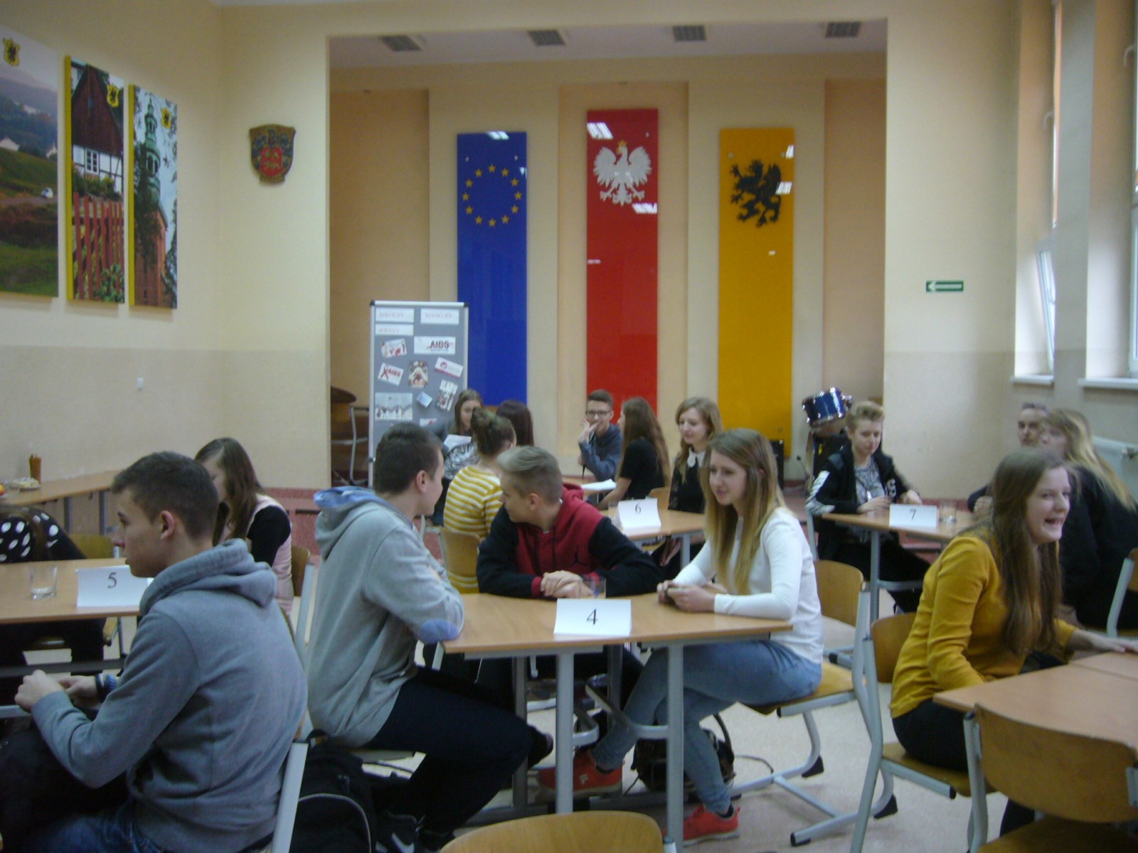 W konkursie wzięły udział 3- osobowe zespoły z klas pierwszych naszej szkoły. Każdy zespół losował po trzy pytania, które punktowane były w skali 0-2 pkt.