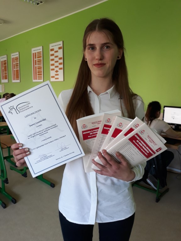 Joanna Łaszewska uczennica klasy II Technikum Ekonomicznego w ZSZiO w Kartuzach uzyskała tytuł finalistki VIII Ogólnopolskiego Konkursu Wiedzy o Podatkach, który odbył się 13 kwietnia 2018 r na Wydziale Prawa i Administracji Uniwersytetu Śląskiego w Katowicach. Ogólnopolski finał tego konkursu zorganizował Śląski Oddział Krajowej Izby Doradców Podatkowych pod honorowym patronatem Śląskiego Kuratora Oświaty. Joanna na wszystkich poziomach szkolnym, wojewódzkim i ogólnopolskim tego konkursu, wykazała się dużą znajomością przepisów z ustaw takich jak: o swobodzie działalności gospodarczej, podatkowych, o doradztwie podatkowym wraz z rozporządzeniami. Były też pytania z niedawno uchwalonej konstytucji dla biznesu. Jest to duży sukces uczennicy naszej uczennicy, gdyż konkurs był trudny i wieloetapowy. Każdy wie jak zawiłe i ciągle zmieniające się jest polskie prawo podatkowe i jak skomplikowane jest jego stosowanie w rozwiązaniach gospodarczych. Asia uczennica klasy drugiej stanęła do rywalizacji z maturzystami i wielu z nich pokonała wykazując się szeroką i pewną wiedzą o systemie podatkowym w Polsce. Uczennica po raz pierwszy z zagadnieniem systemu podatkowego spotkała się na lekcjach z przedmiotów ekonomicznych oraz na szkoleniach podczas realizacji projektów przez Stowarzyszenie dla Rozwoju Edukacji, które wspiera kształcenia w tej szkole. Asia już wie, że dobrze wybrała Technikum Ekonomiczne na Wzgórzu, które jest fundamentem na drodze jej kariery zawodowej w dziedzinie doradztwa podatkowego, księgowości czy też bankowości. Joanna Łaszewska jako przyszły doradca podatkowy zgłębiała wiedzę pod bacznym okiem pani Małgorzaty Klasa, odkrywając coraz to większe zainteresowanie tematem, natomiast opiekę podczas wyjazdu do Katowic sprawowała jej wychowawczyni pani Joanna Wenta.