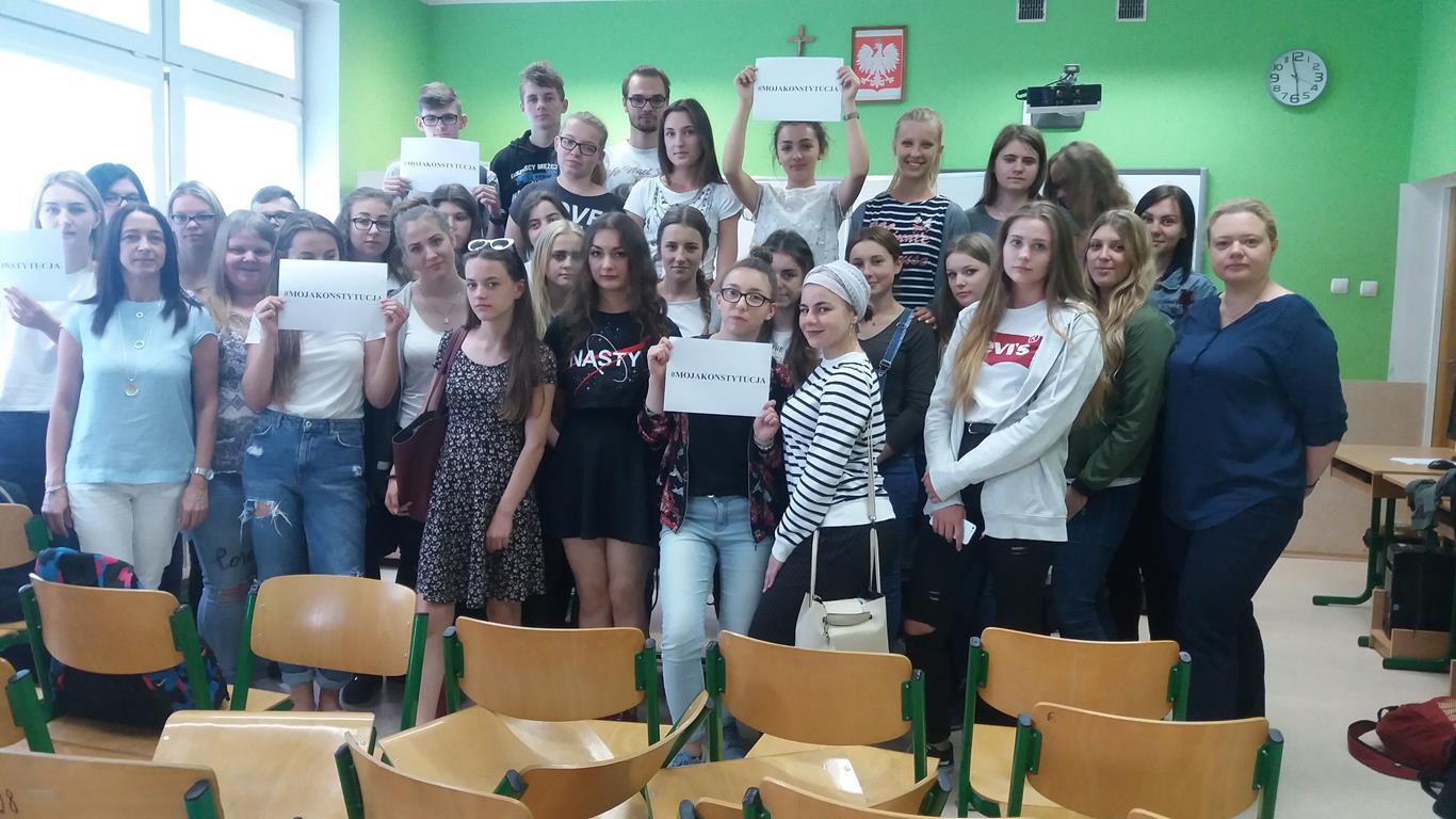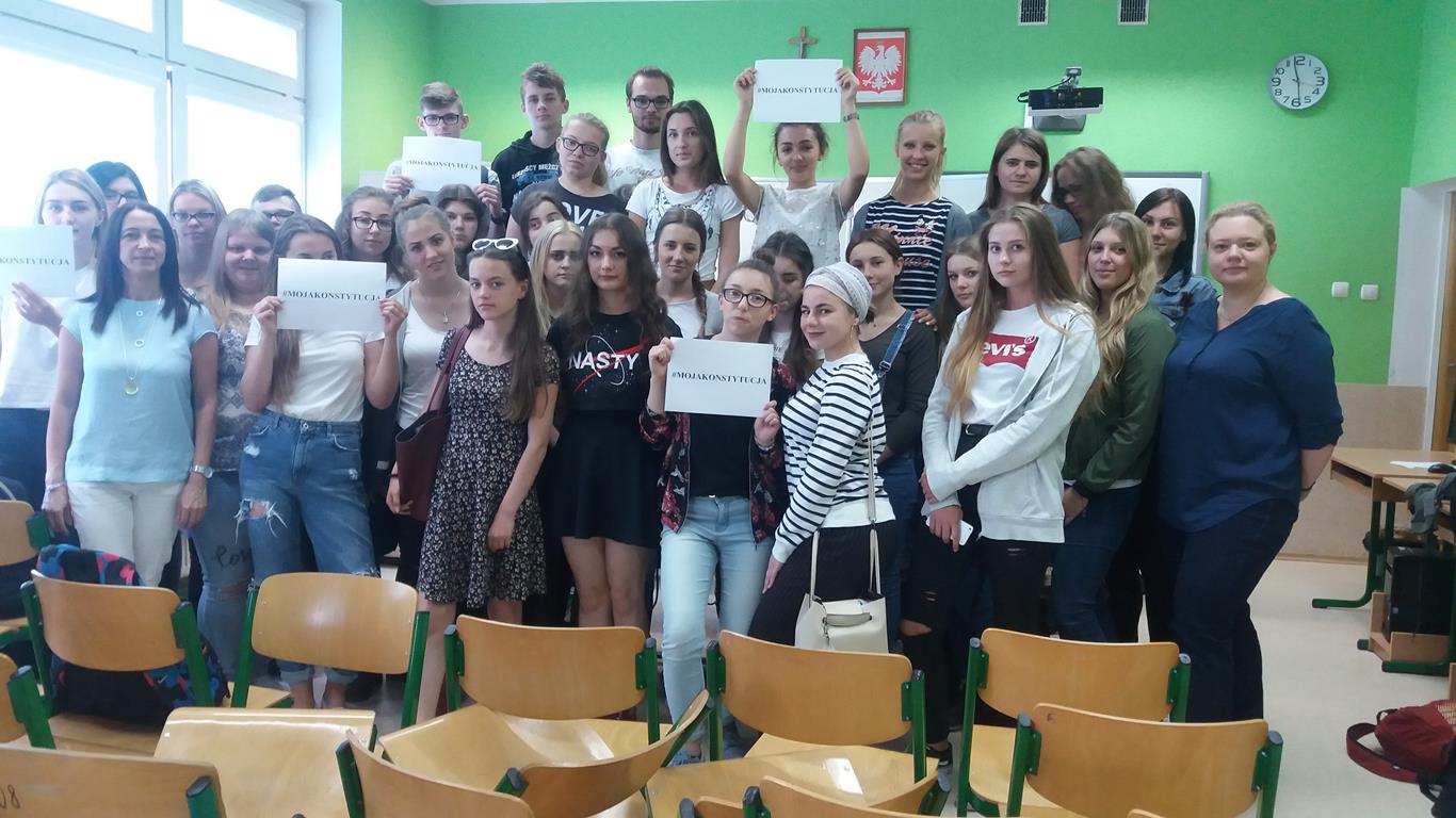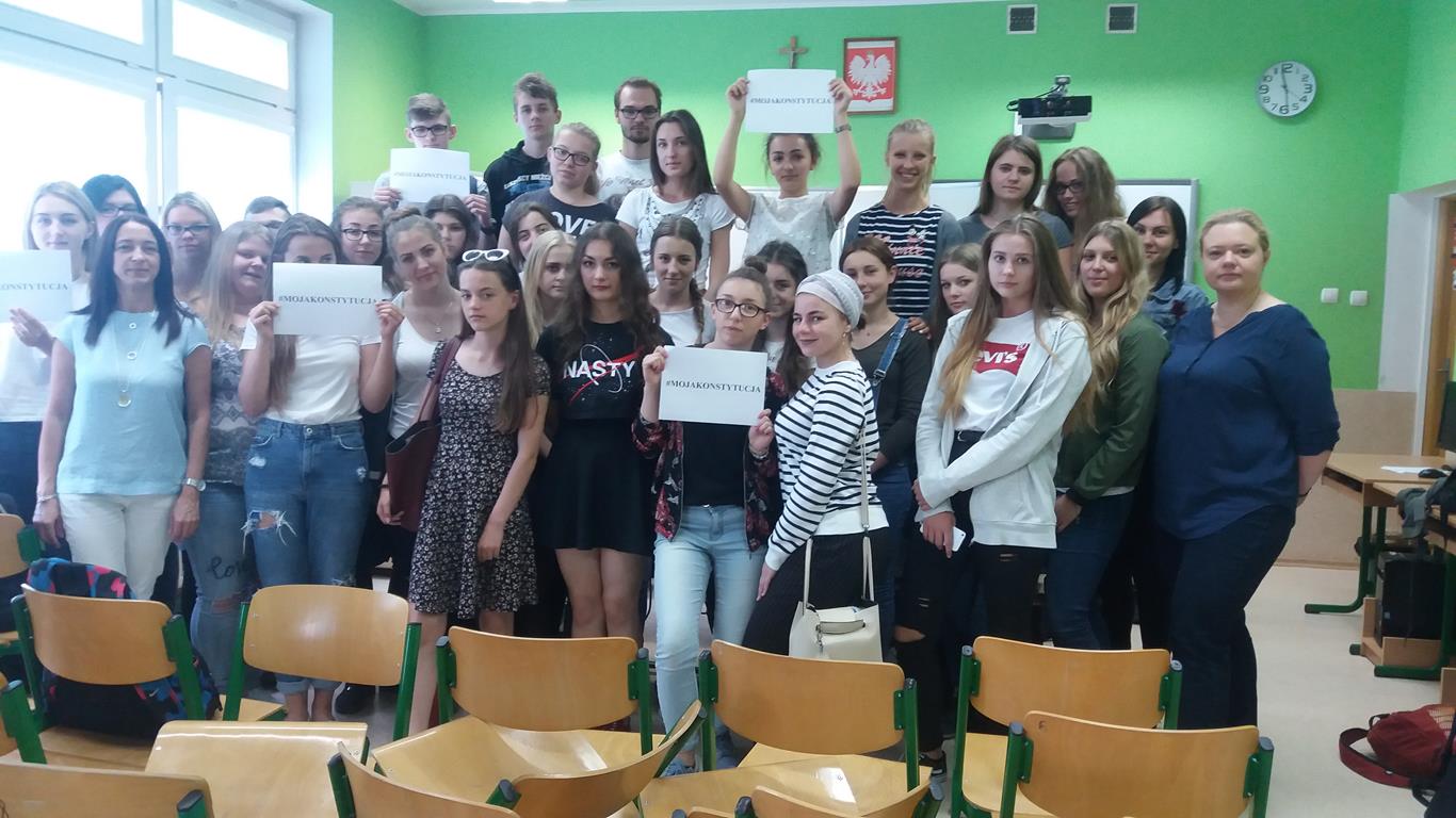 „Dlatego tak, jak się prowadzi dzieci szkolne do muzeum czy na koncert, tak samo powinno się przybliżać im prawo. I uczyć, że z natury rzeczy przeznaczone jest ono do funkcjonowania w świecie, który nie jest doskonały. Jak prawo karne, które działa wobec tych, którzy prawo łamią. I trzeba uczyć, że prawo jest po to, żeby żadnej władzy nie przyszło do głowy hulać zanadto.” – słowa prof. Ewy Łętowskiej wypowiedziane w związku z organizowaną przez Stowarzyszenie im. Prof. Zbigniewa Hołdy akcją edukacyjną Tydzień Konstytucyjny „Moja Konstytucja”. Podczas wydarzenia prawnicy (adwokaci, radcowie prawni, aplikanci, sędziowie, pracownicy naukowi, pracownicy organizacji pozarządowych) udają się do szkół, aby przeprowadzić lekcje i zwrócić uwagę na praktyczny wymiar obowiązywania Konstytucji i działalność Trybunału Konstytucyjnego. W środę 6 czerwca w przystępny i interesujący sposób asesor sądowy Patrycja Bona przeprowadziła warsztaty dla klasy kl.I TE, II TE, III TE, II TOR, II TOI. Podczas czterogodzinnych warsztatów p. Patrycja pokazała, że problematyka konstytucyjna ma bezpośredni wpływ na codzienne życie każdego z nas. Ponadto promowała świadome obywatelstwo, zachęcała młodych ludzi do większego zainteresowania się sprawami publicznymi i zwracała ich uwagę na kluczową rolę sądów powszechnych w stosowaniu prawa w Polsce, przy uwzględnieniu nadrzędnej roli Konstytucji. W czwartek natomiast uczniowie kl. III TH mieli wyjątkową lekcję wychowawczą, bo połączoną z udziałem w rozprawie karnej w sądzie rejonowym w Kartuzach. Celem lekcji wychowawczej było zwiększenie świadomości prawnej wśród nastolatków, w szczególności skierowanej na prawne konsekwencje czynów zabronionych. Rozprawa w sądzie wywarła na młodzieży ogromne wrażenie. To najlepsza forma zwiększenia świadomości i odpowiedzialności za własne czyny.
