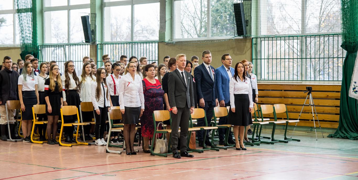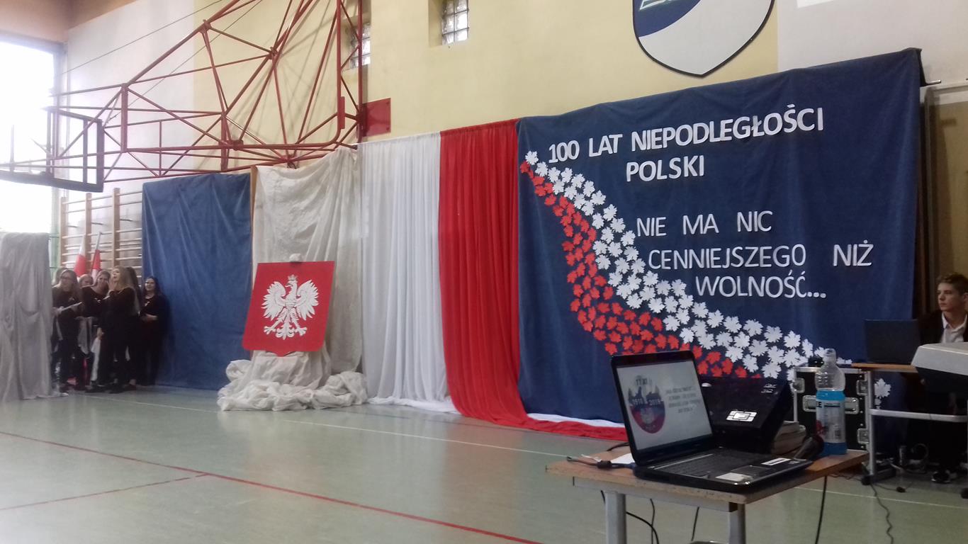 Ten apel, to kulminacja działań i zdarzeń mających miejsce tego dnia w naszej szkole. Młodzież już od godziny ósmej brała udział w konkursie piosenki, poezji, stawała w szranki turniejowe oraz rywalizowała w grze historycznej. Pieczę nad działaniami konkursowymi pełniła p. Marlena; montaż słowno – muzyczny powstał pod czujnym okiem p. Dominiki