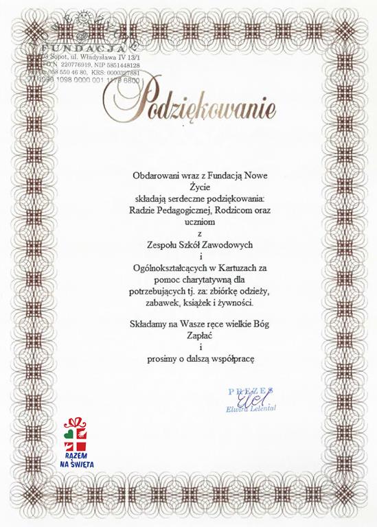 W terminie od 25 listopada do 10 grudnia 2018r. w szkole została zorganizowana zbiórka odzieży, zabawek, książek oraz żywności na cele charytatywne dla podopiecznych Fundacji „ Nowe Życie” w Sopocie.