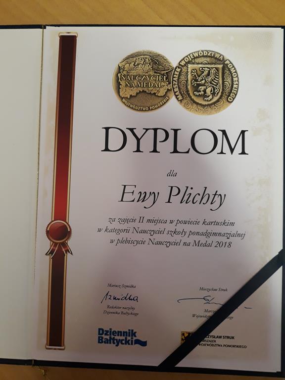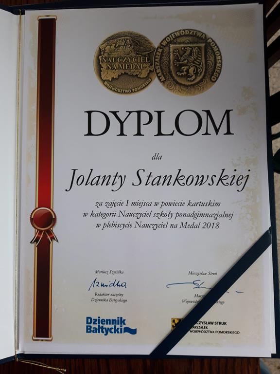 W powiecie kartuskim w kategorii Nauczyciel szkoły ponadgimnazjalnej I miejsce zajęła p. Jolanta Stankowska , otrzymując dyplom oraz medal marszałka województwa pomorskiego, natomiast dyplom za II miejsce otrzymała p. Ewa Plichta.