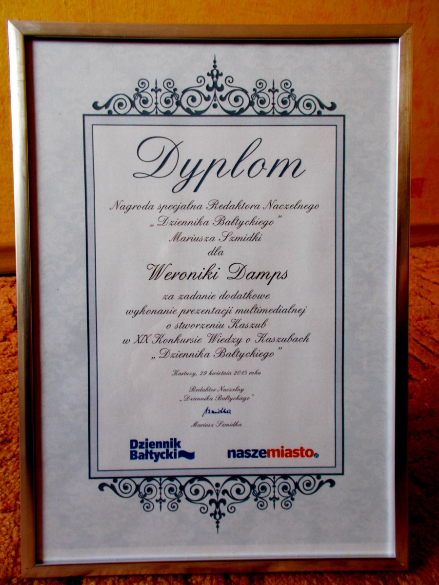 W zadaniu tym brali udział uczniowie z całego regionu. Tym bardziej więc jest to duży sukces. Weronika zdobyła nagrodę specjalną Redaktora Naczelnego „Dziennika Bałtyckiego” – Pana Mariusza Szmidke.