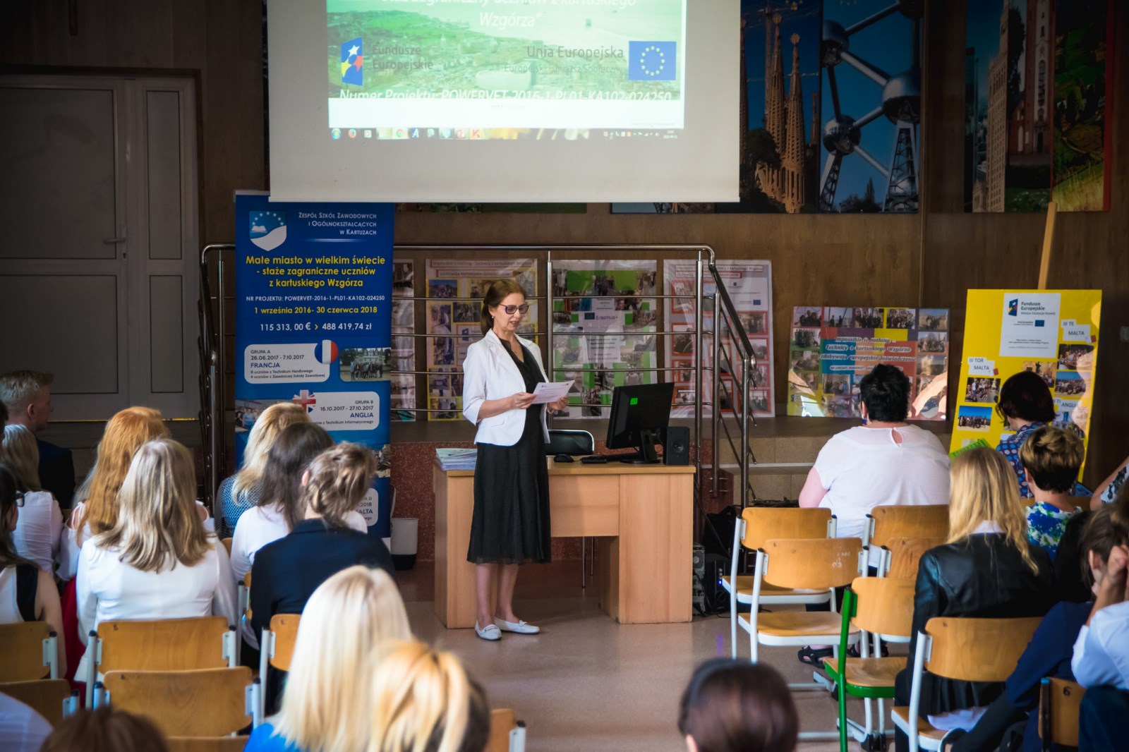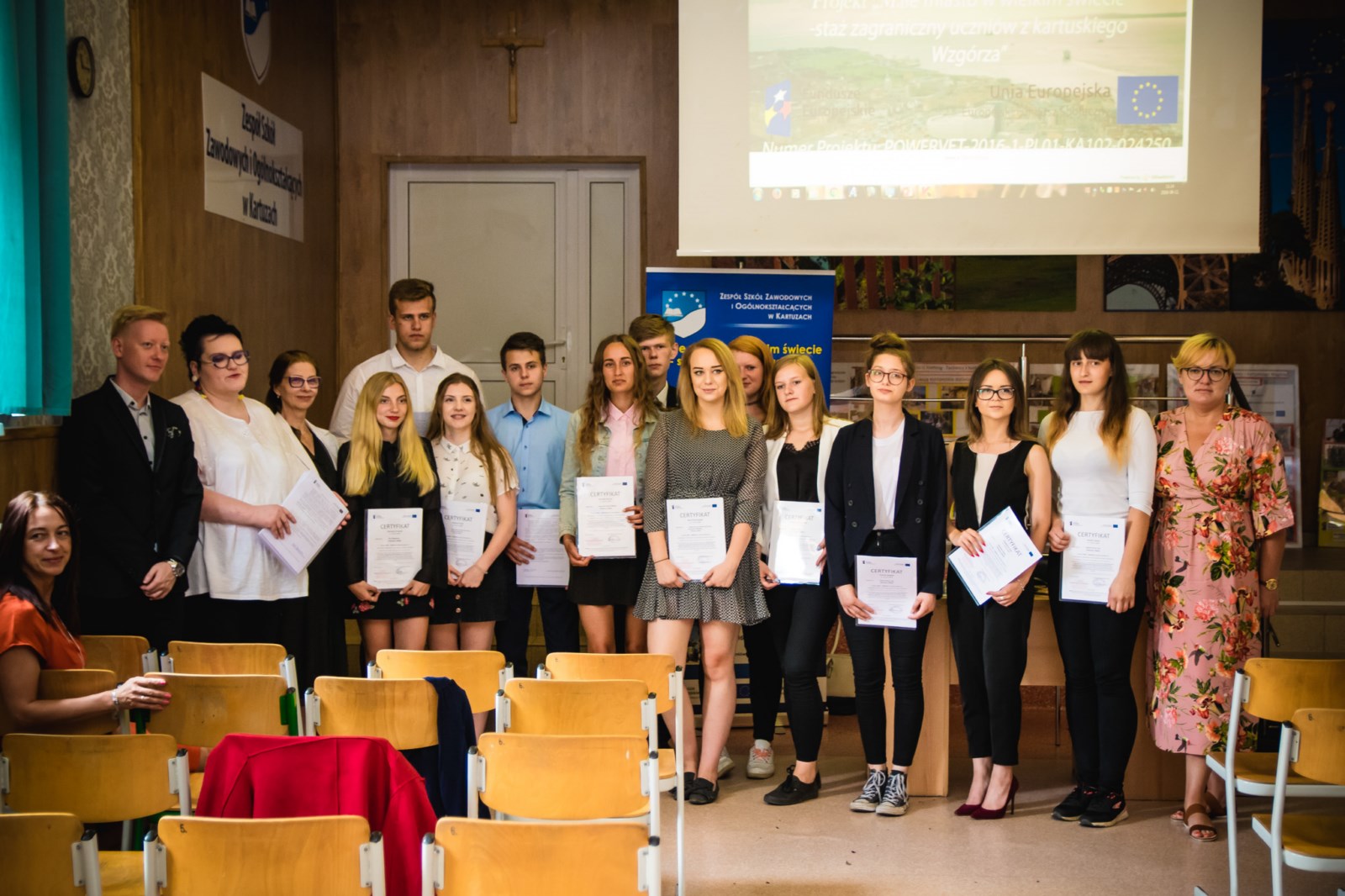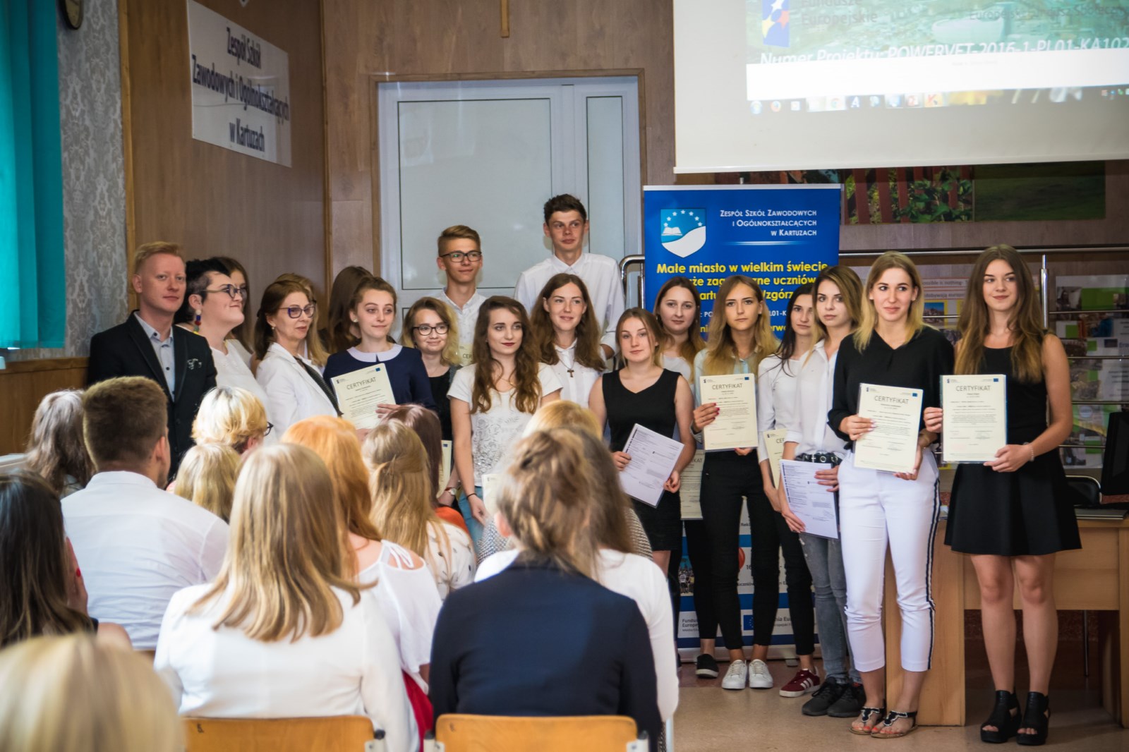 11 czerwca, 2018 roku w Auli Zespołu Szkół Zawodowych i Ogólnokształcących w Kartuzach odbyło się spotkanie podsumowujące realizację projektu Małe miasto w wielkim świecie- staże zagraniczne uczniów z kartuskiego Wzgórza nr umowy: POWERVET-2016-1-PL01-KA102-024250.