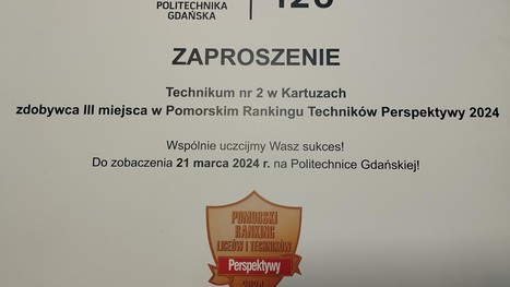 Z ogromną przyjemnością informujemy, że nasza szkoła zajęła 3 miejsce w województwie pomorskim w Ogólnopolskim Rankingu Techników przygotowanym przez „Perspektywy”. W skali kraju zajęliśmy 51...