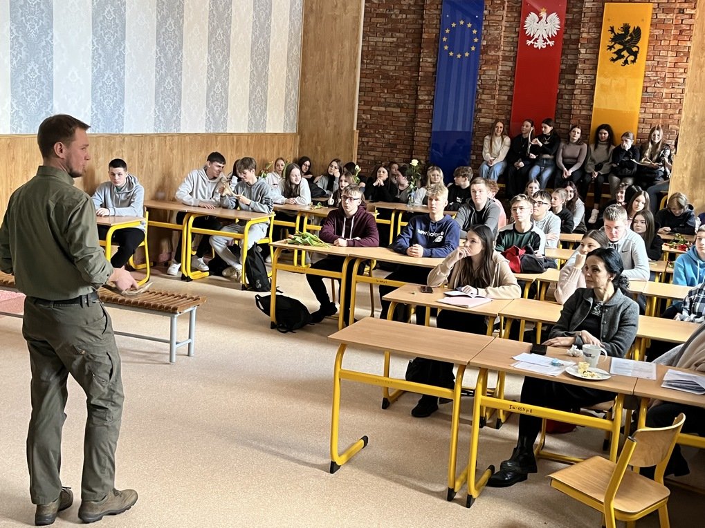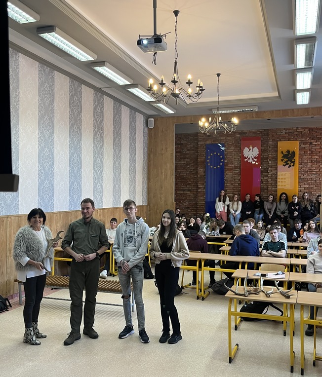w którym wzięli udział zainteresowani uczniowie z kilku klas. Pan Marcin opowiedział uczniom jak wygląda praca opiekuna lasu. Okazuje się, że lasy mają ogromne znaczenie dla klimatu, gospodarki, pełnią funkcje ochronne, są też miejscem do wypoczynku, rekreacji, siedliskiem dla wielu gatunków roślin, grzybów i zwierząt. Niestety wciąż wiele ludzi pozbywa się śmieci zostawiając je w lasach,