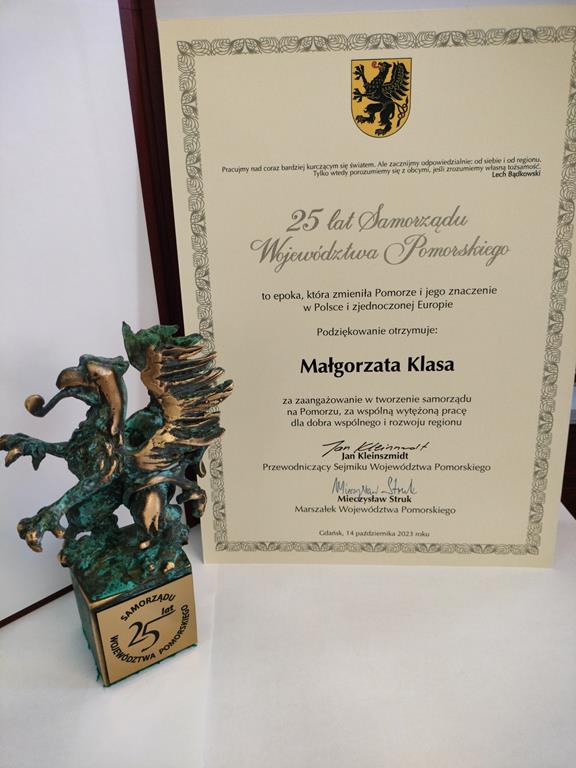 Każdy z laureatów otrzymał statuetkę Gryfa Pomorskiego oraz pamiątkowy dyplom. Wśród wyróżnionych bohaterów znalazła się Pani Małgorzata Klasa, wieloletnia nauczycielka rachunkowości finansowej w ZSZiO w Kartuzach.