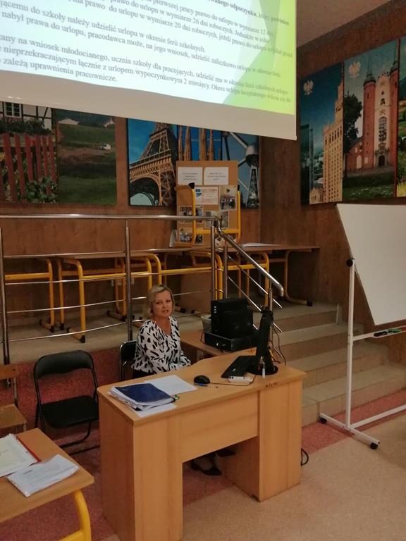 W dniu 17.10.2023rw auli szkoły odbyło się spotkanie instruktażowe dla pracodawców szkolących pracowników młodocianych . Zastępca Kierownika szkolenia praktycznego Pani Jolanta Stankowska omówiła prawa i obowiązki pracowników młodocianych i pracodawców, w formie prezentacji.