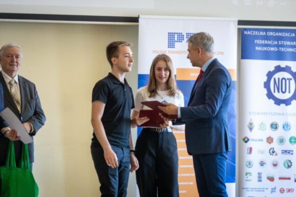 W piątek 7 czerwca br. w Warszawskim Domu Technika NOT uczniowie klasy III TE Wiktoria Żołądź i Dominik Wałaszkowski wzięli udział w uroczystej gali podsumowującej ogólnopolski konkurs informatyczny GEEK „Postaw na wynalazek”, w którym zajęli 2. miejsce. Nagrody laureatom wręczał Wiceprezes Rady Ministrów Pan Krzysztof Gawkowski. Pan Minister wygłosił okolicznościowy wykład na temat „Patentować czy nie patentować – dylematy twórcy”. Wzbudził on bardzo duże zainteresowanie laureatów konkursu.