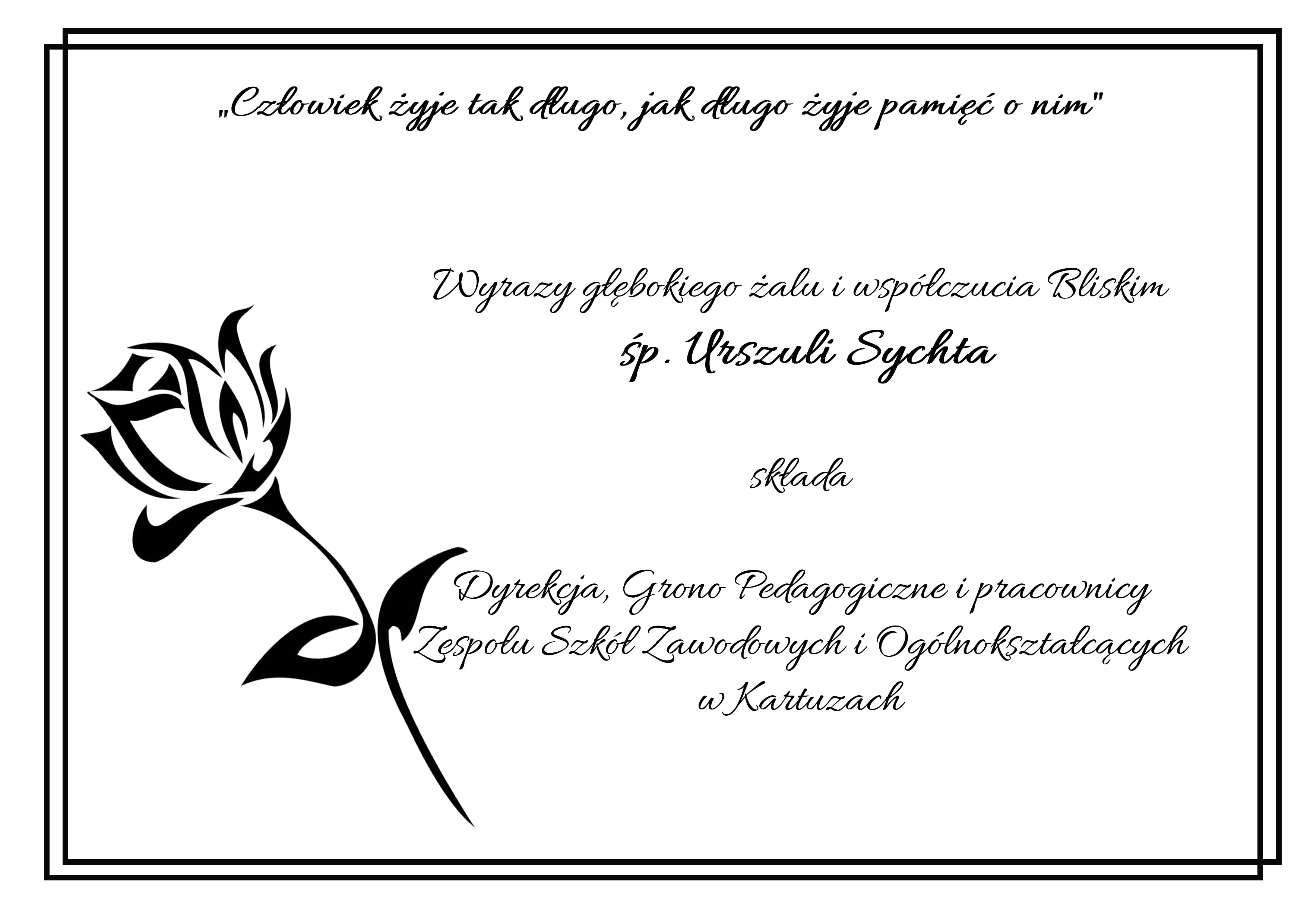 Dyrekcja, Grono Pedagogiczne i pracownicy Zespołu Szkół Zawodowych i Ogólnokształcących w Kartuzach pragną złożyć wyrazy głębokiego współczucia Bliskim śp. Urszuli Sychta