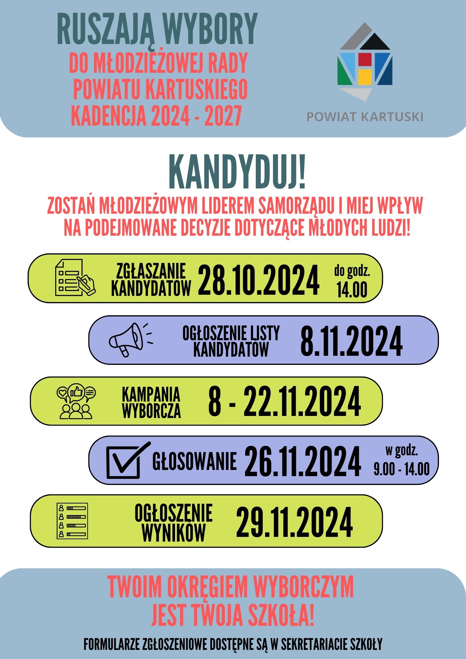 Rusza kampania wyborcza kandydatów zakwalifikowanych do wyborów do Młodzieżowej Rady Powiatu Kartuskiego. W trakcie kampanii nasi kandydaci promują swoje programy wyborcze przy użyciu różnych środków masowego przekazu. Jednak ostateczna decyzja o tym, kto będzie reprezentował naszą szkołę w Młodzieżowej radzie zależy od Was, bo to Wy 26 listopada w godzinach 9.00 - 14.00 oddacie swój głos w wyborach.