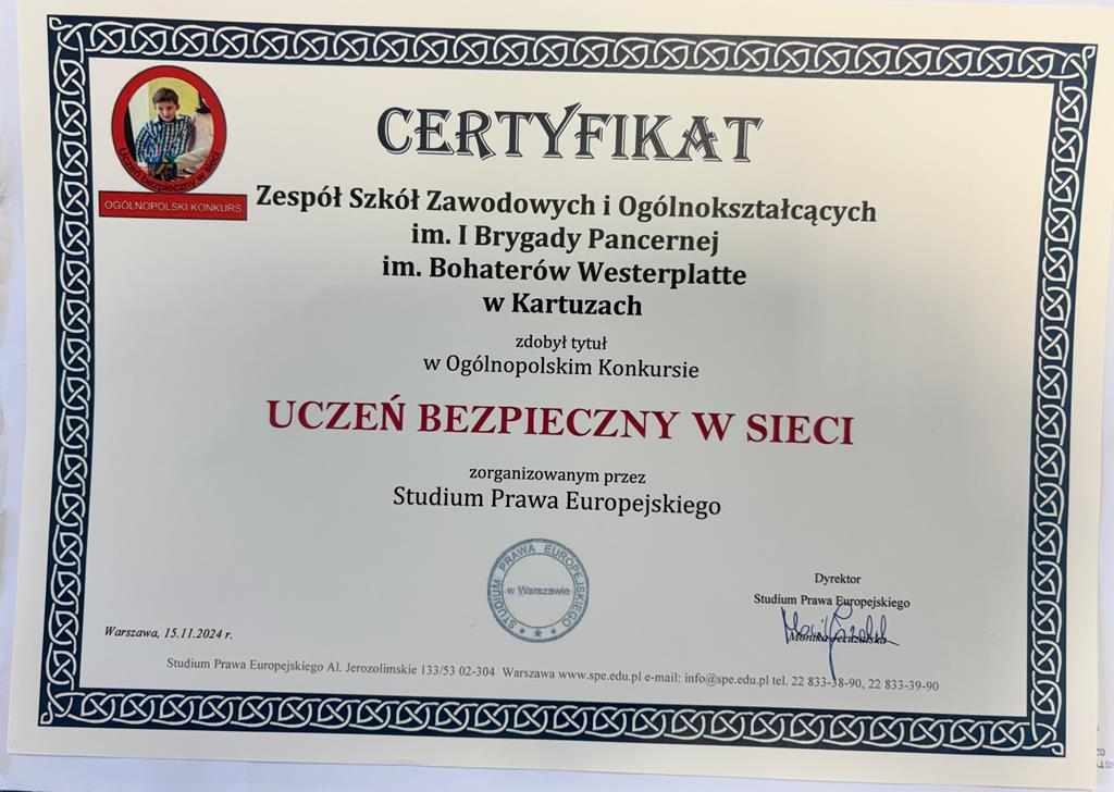 Wyżej wymienione inicjatywy i obszerna dokumentacja zostały ocenione przez jury konkursu maksymalną liczbą punktów. Efektem podjętych działań jest Certyfikat „Uczeń bezpieczny w sieci”, który przyznano naszej szkole 12 grudnia 2024 roku.