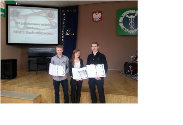 11 grudnia 2015 roku uczniowie tej samej klasy, w gronie powiększonym o Paulinę Grzenkowicz udali się na kolejny konkurs do Torunia. Postanowili zmierzyć się ze 160 uczniami 36 różnych szkół z całego kraju w XVI Ogólnopolskim Konkursie Wiedzy z Rachunkowości. Wśród finalistów znów znaleźli się uczniowie naszej szkoły: Tomasz Jeliński oraz Julita Bach, która w ramach nagrody otrzymała indeks na dowolny kierunek Uniwersytetu Mikołaja Kopernika w Toruniu.