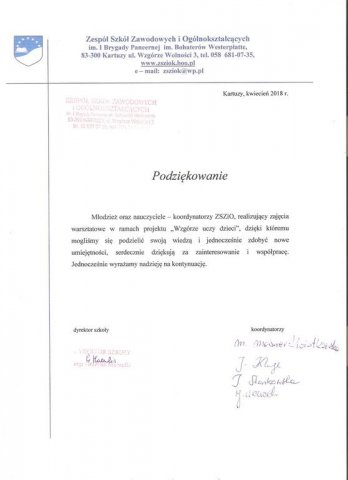 W imieniu koordynatorów, p. J. Kluge, M. Meisner – Kwiatkowskiej, J. Stankowskiej i J. Wieczorek chciałabym wyrazić uznanie oraz podziękować za profesjonalnie przeprowadzone zajęcia, naszym uczniom z klasy: II TOR Julii Szweda, Julii Steinka oraz Paulinie i Alicji Butowskim; II TI Sewerynowi Formela, Pawłowi Głowienka, Adrianowi Kuberna i Tomaszowi Bulczak; II TE Monice Kitowskiej, Martynie Tusk i Klaudii Domarus;