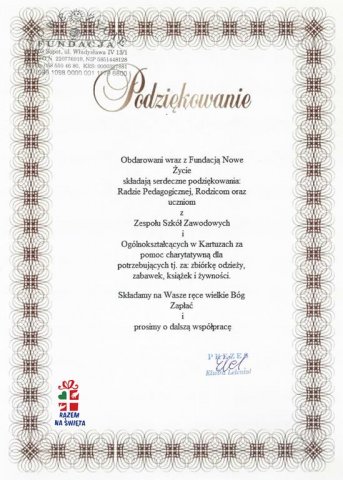 W terminie od 25 listopada do 10 grudnia 2018r. w szkole została zorganizowana zbiórka odzieży, zabawek, książek oraz żywności na cele charytatywne dla podopiecznych Fundacji „ Nowe Życie” w Sopocie.