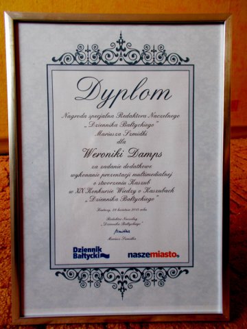 W zadaniu tym brali udział uczniowie z całego regionu. Tym bardziej więc jest to duży sukces. Weronika zdobyła nagrodę specjalną Redaktora Naczelnego „Dziennika Bałtyckiego” – Pana Mariusza Szmidke.