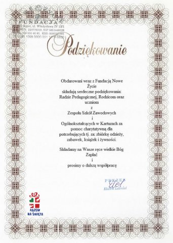 W terminie od 25 listopada do 10 grudnia 2018r. w szkole została zorganizowana zbiórka odzieży, zabawek, książek oraz żywności na cele charytatywne dla podopiecznych Fundacji „ Nowe Życie” w Sopocie.