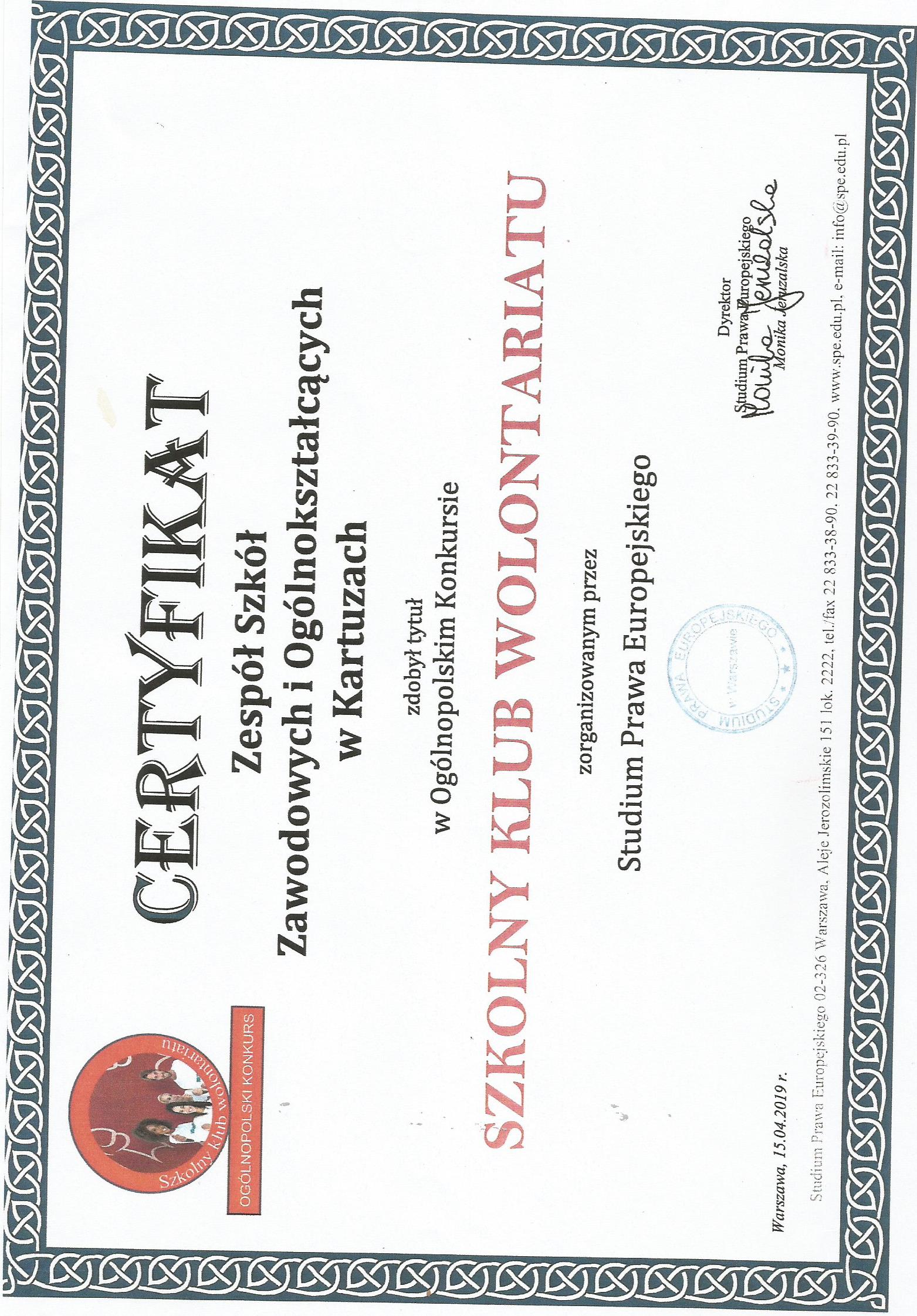 ZDOBYCIE CERTYFIKATU „SZKOLNY KLUB WOLONTARIATU”