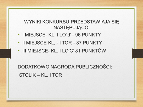 Laureaci: tytuł „Szkolnego Mistrza savoir vivre” otrzymała klasa I LOd; drugie miejsce klasa I TOR; trzecie - I LOc; nagrodę publiczności za najładniej nakryty stół zdobyła klasa I TOR.