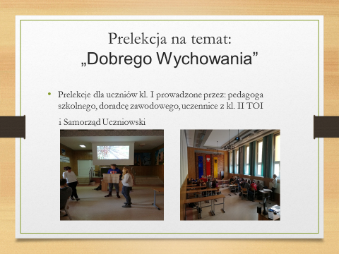 W ramach realizacji projektu „ Szkoła dobrego Wychowania w miesiącu marcu 2018r. odbył się szkolny konkurs dla uczniów klas drugich i trzecich technikum. W ramach tego konkursu zadaniem uczniów było przygotowanie filmu lub prezentacji instruktażowej zgodnie z tematyką: „ Savoir vivre na co dzień….”